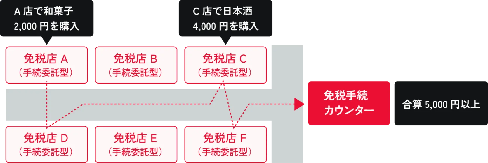 免税手続カウンターで合算金額を管理している場合、同一特定商業施設内での他の手続委託型消費税免税店と販売額を合算して下限金額を超えた場合に免税販売が可能となります。